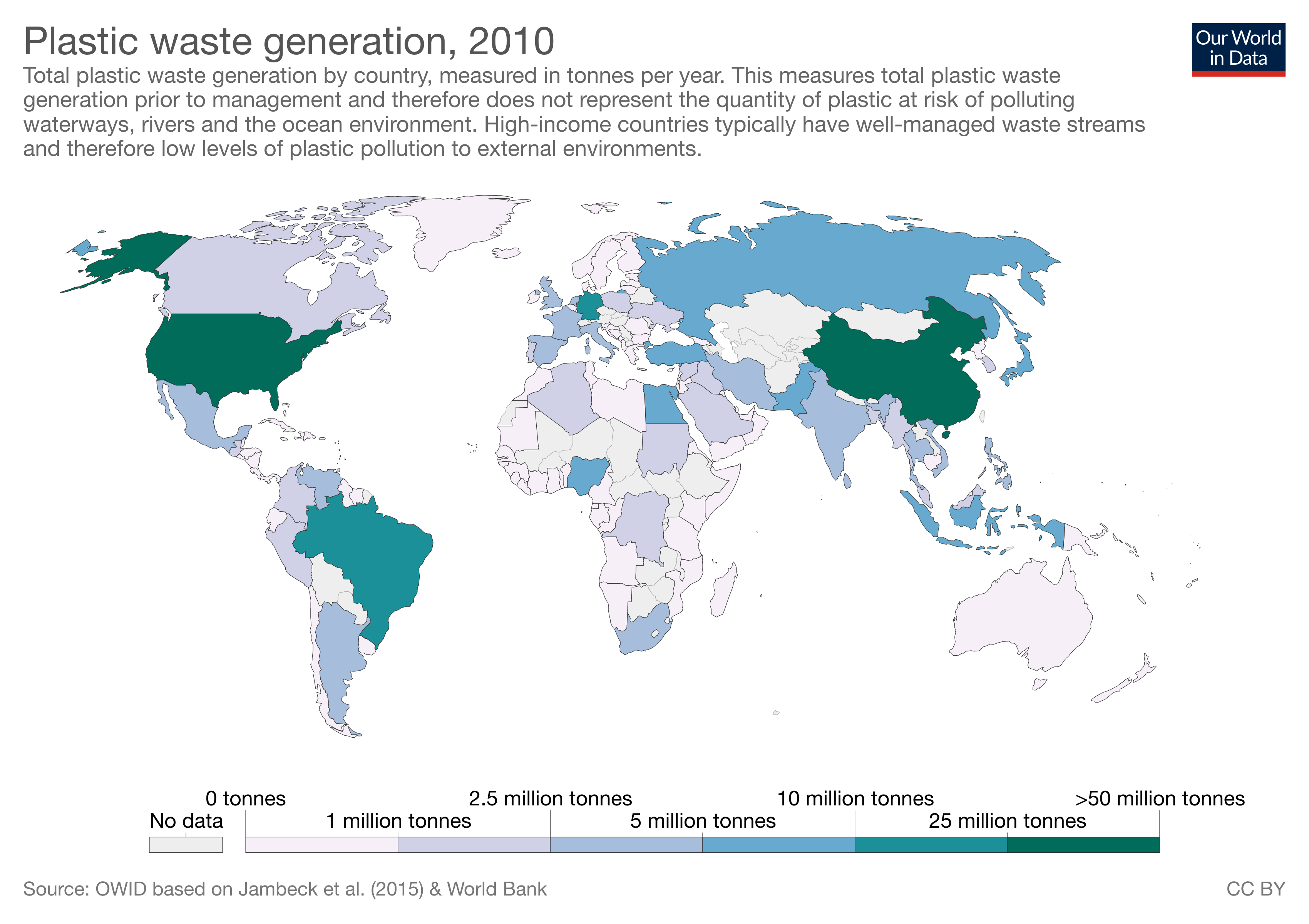Plastics that are effectively collected, incinerated, or recycled throughout a tightly “sealed” supply chain do not kill wildlife. Plastics that are managed in a closed landfill do not end up in the ocean. More plastic use does lead to more plastic waste, but reducing production is only one strategy – capturing and managing new and existing plastics is also key. See graphics below from Our World in Data.