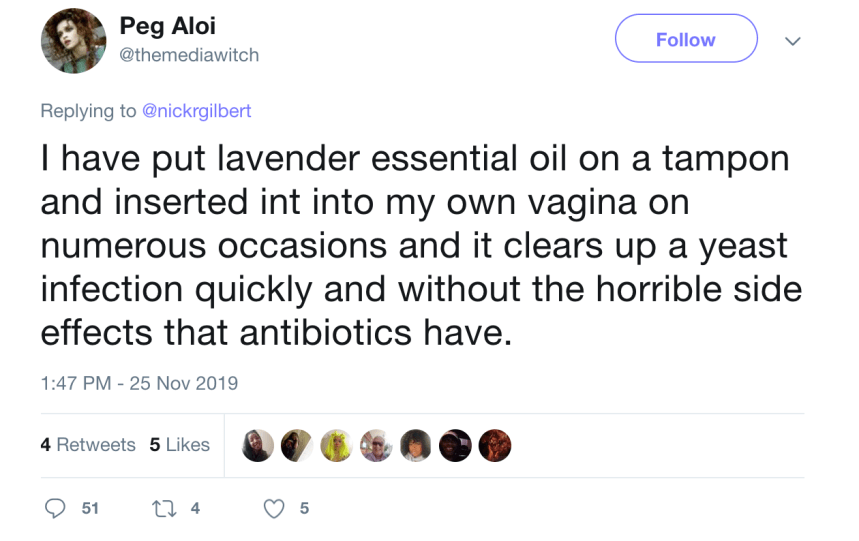 This tweet is not only incorrect (yeast infection treatment is anti-fungal, not antibiotic), but also incredibly dangerous (essential oil is super concentrated and could lead to burns if not dosed and administered correctly). If you see this kind of stuff online, pull out every tool you’ve got in your tool box: condemn it, challenge it, report it for misinformation, urge others to not follow this advice, etc…you get my point. THIS IS BAAAAAD.