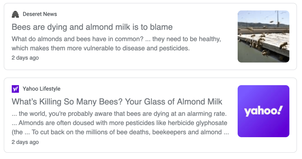 We are trudging into harder-to-spot/define territory. Here are some recent headlines linking the almond industry to collapsing bee population, as well as a Facebook post that alerted me to the story and a reader comment.