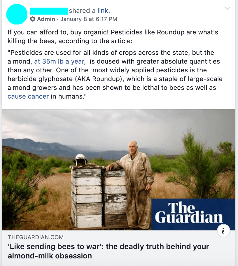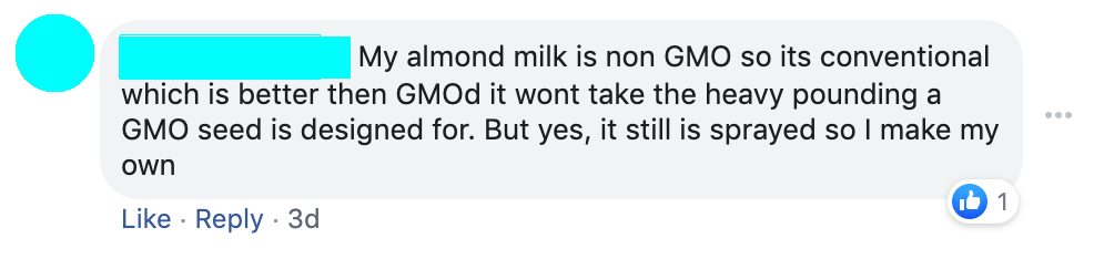 I see a lot of issues here: 1) re. headlines: blaming “bee-killing” on consumers’ almond milk habits is click-baity, reductionist, and misleading, serving no purpose other than attention-grabbing. 2) re. the person reposting the story: summarizing it as “pesticides are killing bees” is also reductionist and misleading – as anyone who’s read the Guardian article will tell you that in addition to pesticide exposure, it also discusses parasitic disease, habitat loss, industrial agriculture, and European honeybee species outcompeting native pollinator species. 3) re. the person responding: oh boy. There is no GMO almond, so I have no idea what this responder is even saying.