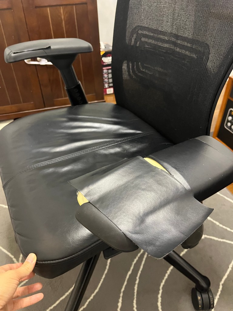 My partner scored this amazing used office chair when we set up our work-from-home space a few years ago; over time however, the leather on the armrests started to tear. At first I tried to cover up the damages with self adhesive leather patches, but eventually those stopped working too. Here was how the chair looked as of last week: it was bad.